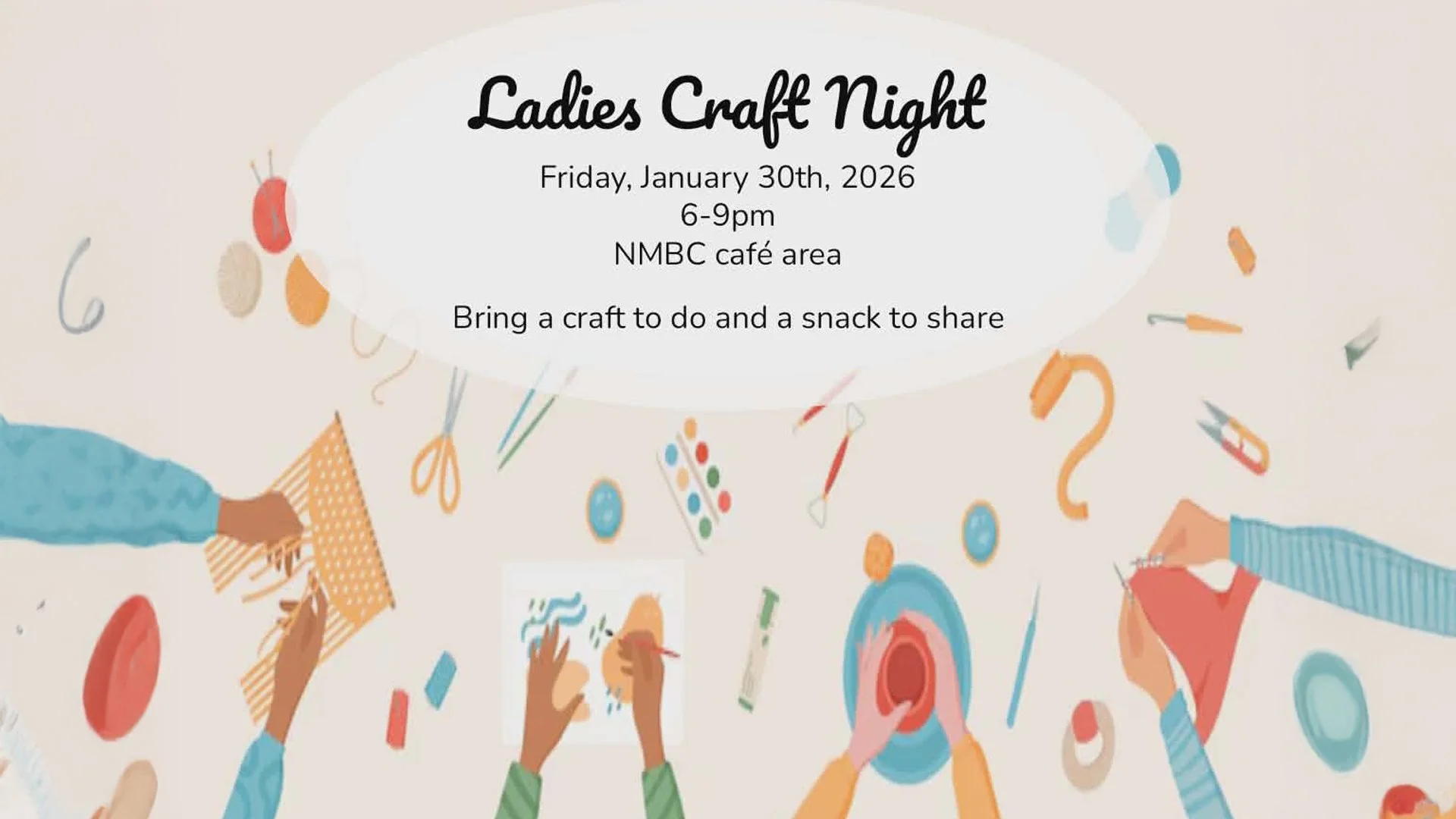 A ladies Craft Night is scheduled for Friday, January 30 in the Cafe, from 6:00pm to 9:00pm. Please bring a craft and a snack to share.
