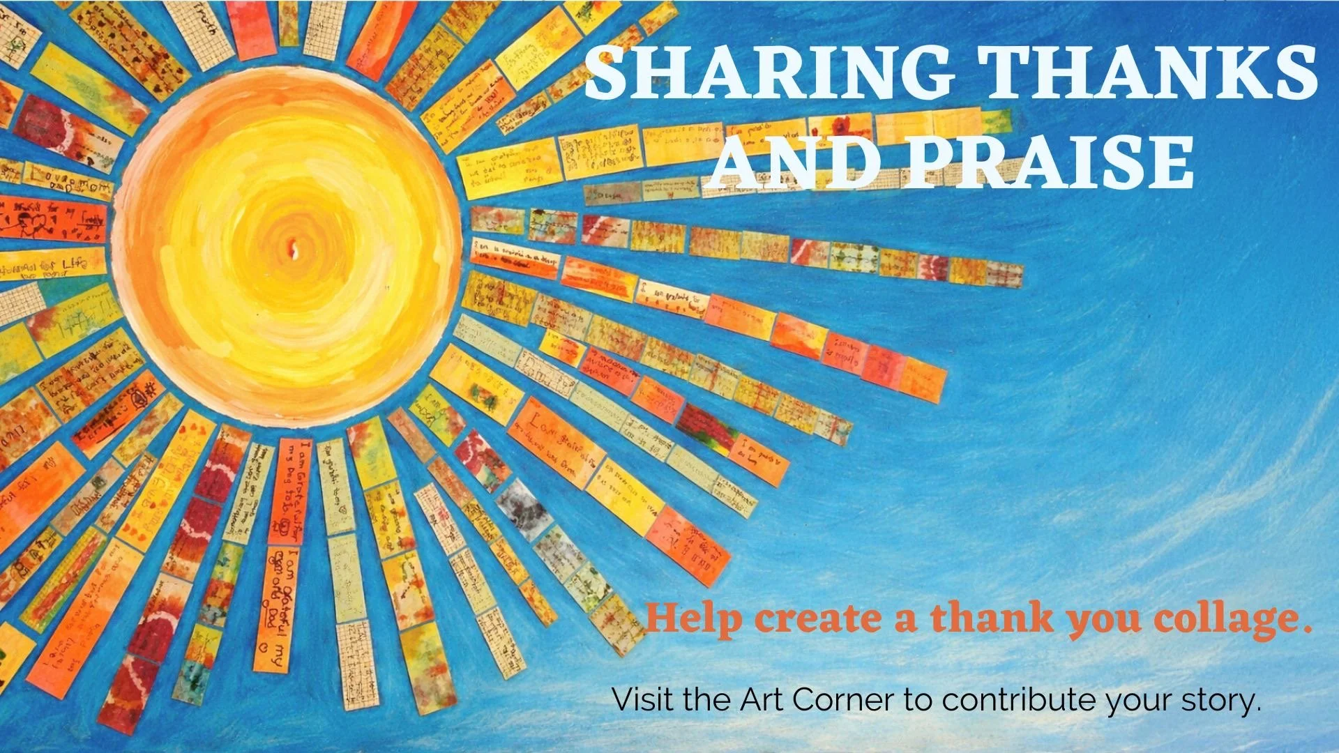 To share your story of thanks please visit the table in the art corner and take one of the rays of sunshine to write on at home (and bring it back) or at one of the tables at church. Please keep it to one or two sentences to fit on each painted slip of paper. For any questions see Avery Peters (avery.peters@gmail.com).