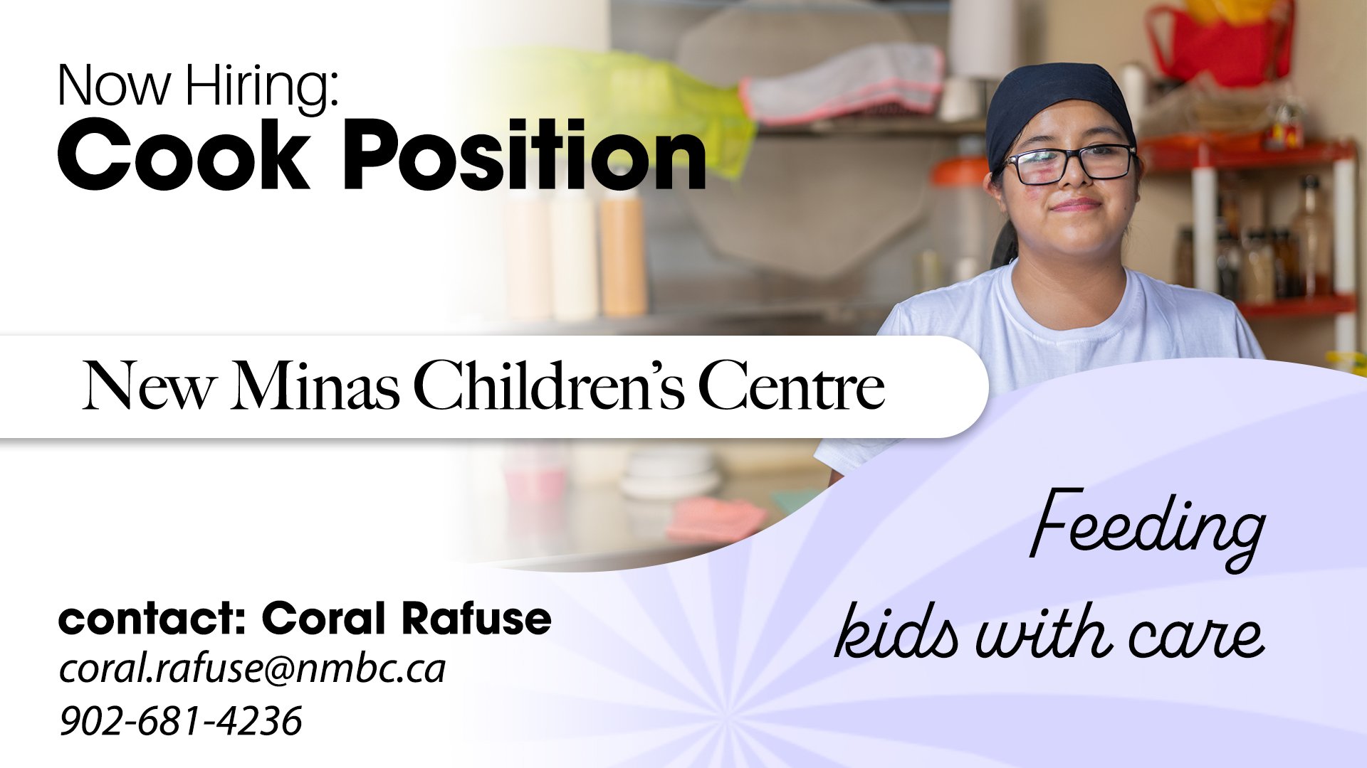 New Minas Children’s Centre is looking for a cook. Position is available by January 2nd or before. If you are an experienced cook with strong time management and food safe skills, come join our dynamic team!